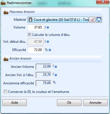 Aller à la navigationAller à la rechercheLe bouton Redimensionner de la barre d'outils (ruban) pour la fenêtre Mes Recettes ou de n'importe quelle recette permet d'agrandir ou diminuer le volume, en gardant la densité initiale, l'amertume et la couleur les plus proches possible de la recette originale. En utilisant cette commande vous pouvez redimensionner une recette pour l'adapter à votre profil de matériel, un volume de brassin différent ou pour ajuster l'efficacité de votre installation pour une recette donnée.